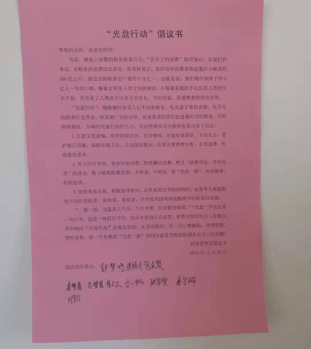 为大力弘扬中华民族勤俭节约的优良传统,宣传节约光荣、浪费可耻的思想,培养健康文明的餐饮文化,经济管理系组织蒲公英志愿者服务队于12月20日-12月26日开展主题为“拒绝舌尖上的浪费之光盘行动”。